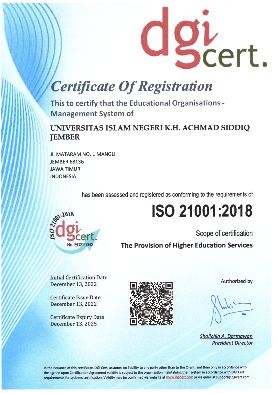 Penyerahan Sertifikat ISO 9001:2015 dan ISO 21001:2018 kepada Pimpinan UIN KHAS Jember